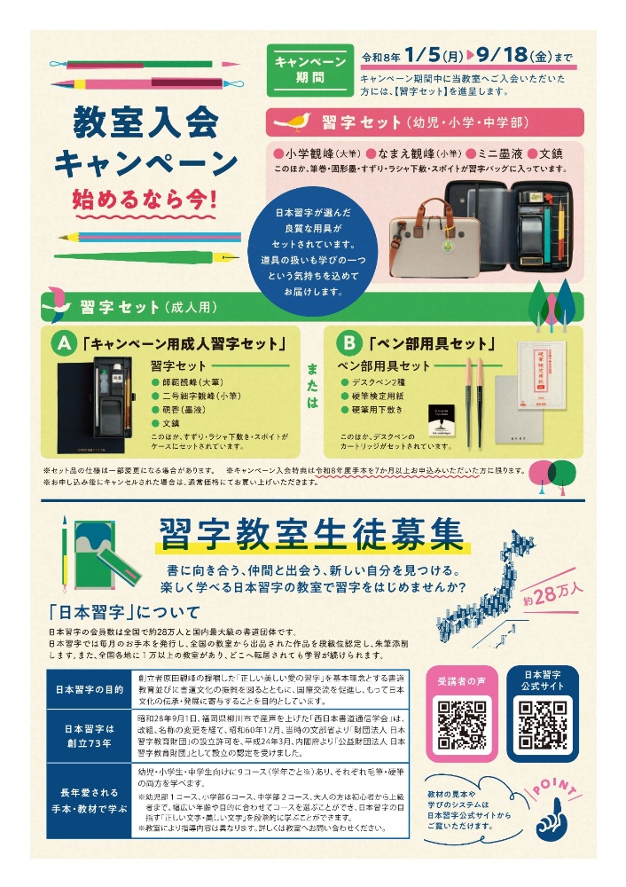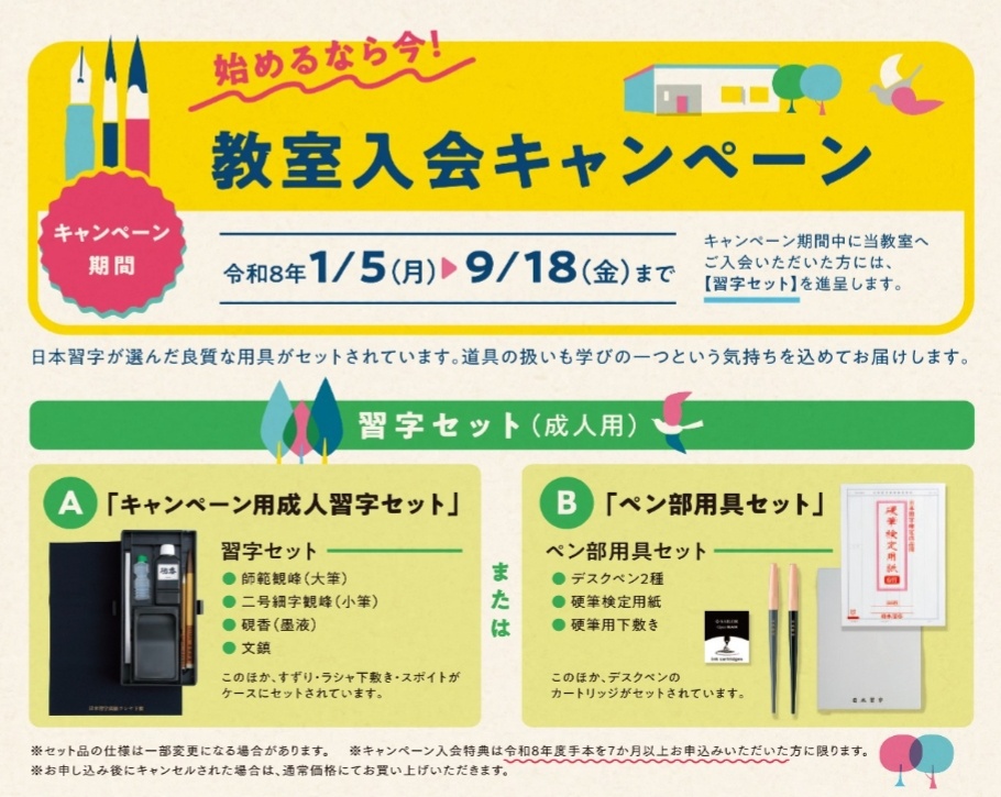 ご入会で習字セット成人用(6240円)プレゼントキャンペーン実施中です😊