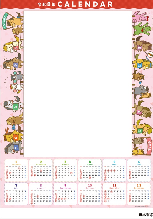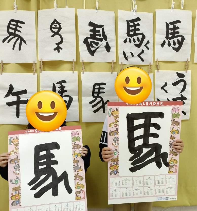 2026年の可愛い馬柄干支カレンダーに筆と墨を使って文字を書きます。🐴